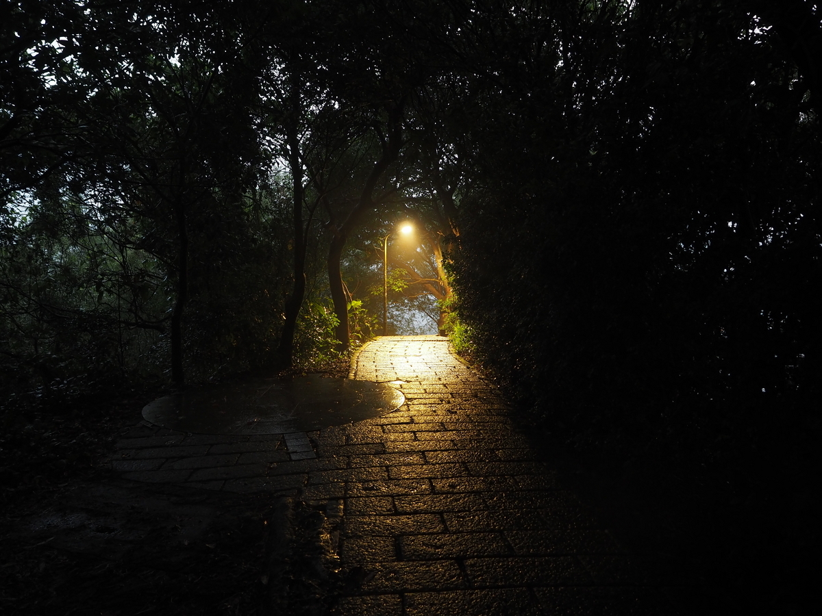 やがて登山道は真っ暗になりました。一度はやんだ雨がまたザーザーと降ってきて、全身を濡らします。普段山を歩く時なら雨具必携の天気ですが、今回は身一つで出てきたのであっという間にずぶ濡れになりました。でも、真夏の8月の暑い夕方、こうして雨に打たれていると身も心も洗われるようで、かえって気持ちの良いものです。