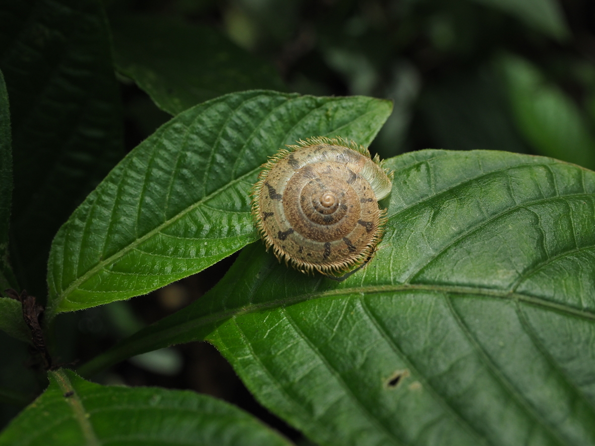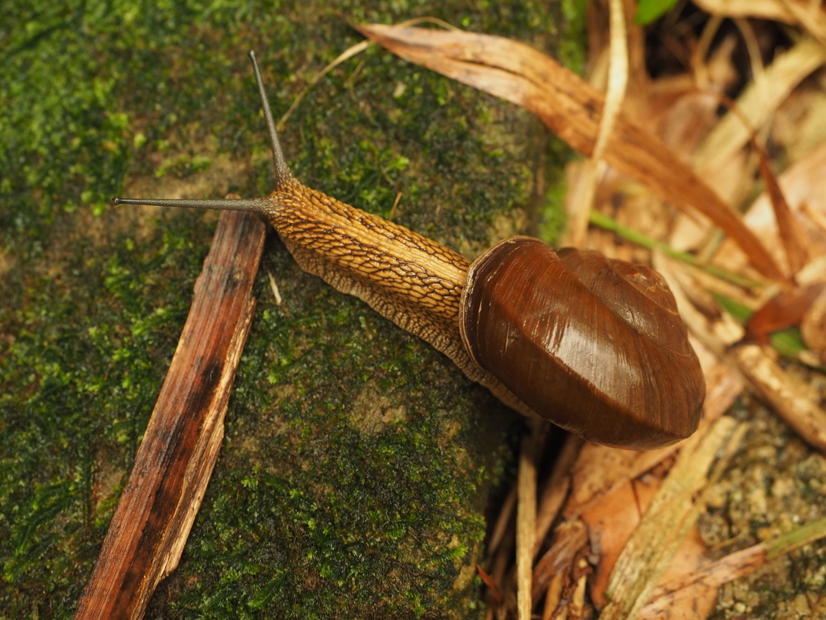 さて、期待していたカタツムリですが、登山道の周囲をよく観察していると2匹の台湾在来種のカタツムリを見つけることができました。普段は気にも留めない「つの」の動きをや殻の模様をまじまじと眺めていると、自分の中でのカタツムリのイメージが今までよりも具体的に、そして豊富になってくるのを感じます。